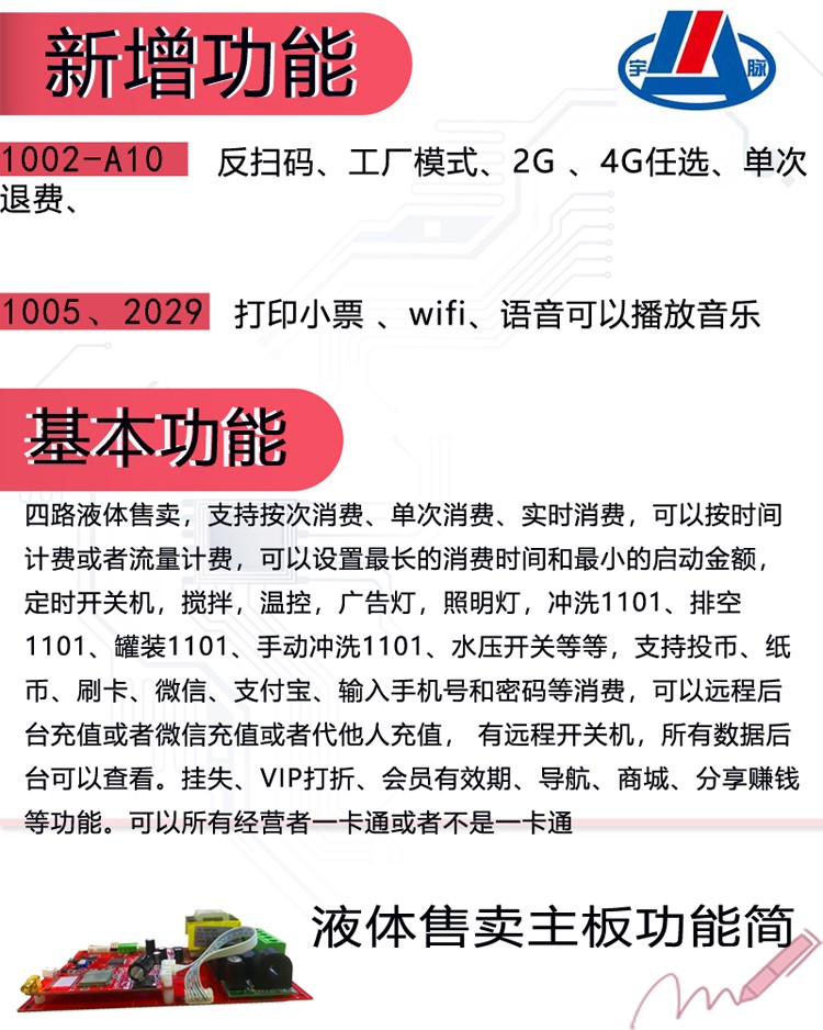 自助售洗衣液机具有 GSM卡联网短信功能,远程短信开机/锁机,短信报账,故障报警,无水压短信提醒、温度短信等,语音播报,温度控制,设置最低消费金额、清洗、自动搅拌、售两种液体等功能。 宇脉自助洗衣液主板厂家 欢迎来电咨询 18520500709/400-1898-020